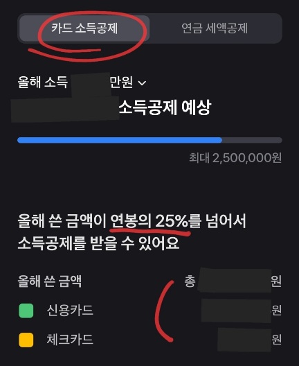 카드 소득공제는 연봉의 25%를 넘어야지만 공제가 가능해요. 본인의 소득을 고려해 사용한 카드값을 계산해서 알아서 보여줍니다.