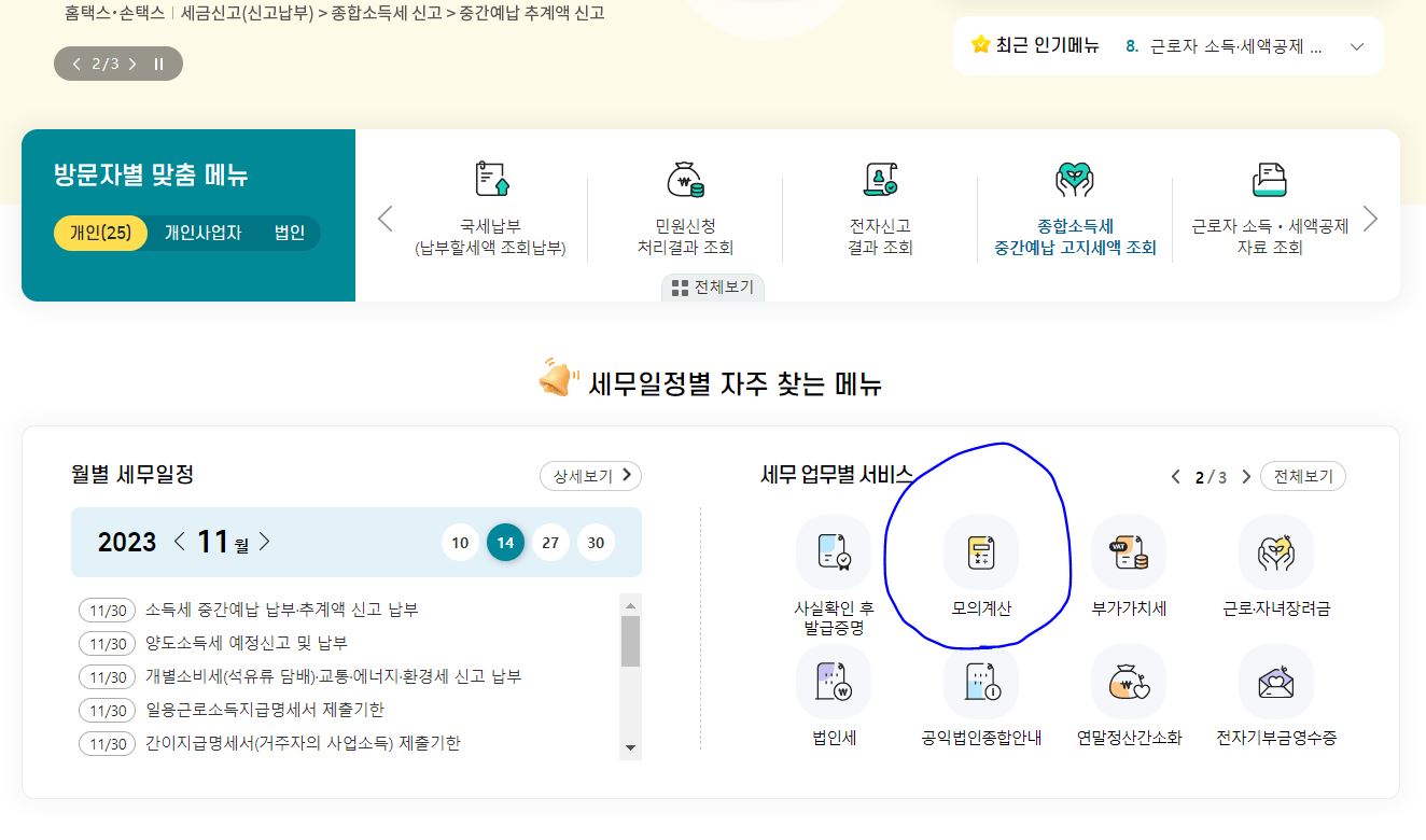 국세청 홈택스 접속해 메인 화면의 오른쪽 중간 세무 업무별 서비스 항목들 중 "모의 계산"을 클릭하고 페이지 이동 후 스크롤을 내려 "연말정산 자동계산하기"를 클릭, 2023을 선택합니다. 이후 상세한 단계는 페이지 하단에서 설명할게요.