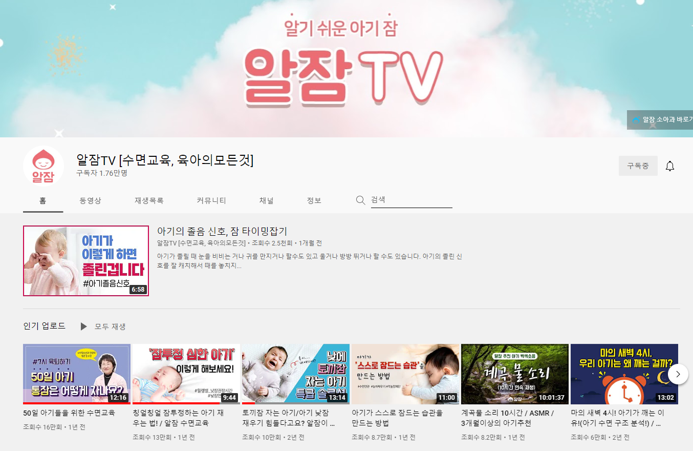 아기들의 수면만을 연구하는 아주 전문적인 채널입니다. 소아청소년과 전문의 선생님과 2명의 엄마가 콘텐츠를 진행합니다. 신생아 키우기, 사실 잠과의 전쟁이죠. 저도 새벽에 제가 어떻게 버티고 있는지 모르겠습니다. 그래도 요즘엔 밤잠이 조금씩 길어지고 있어서 한 번만 일어나 수유를 해주면 되는데요. 문제는 낮잠이 줄어들고 있다는 거예요.