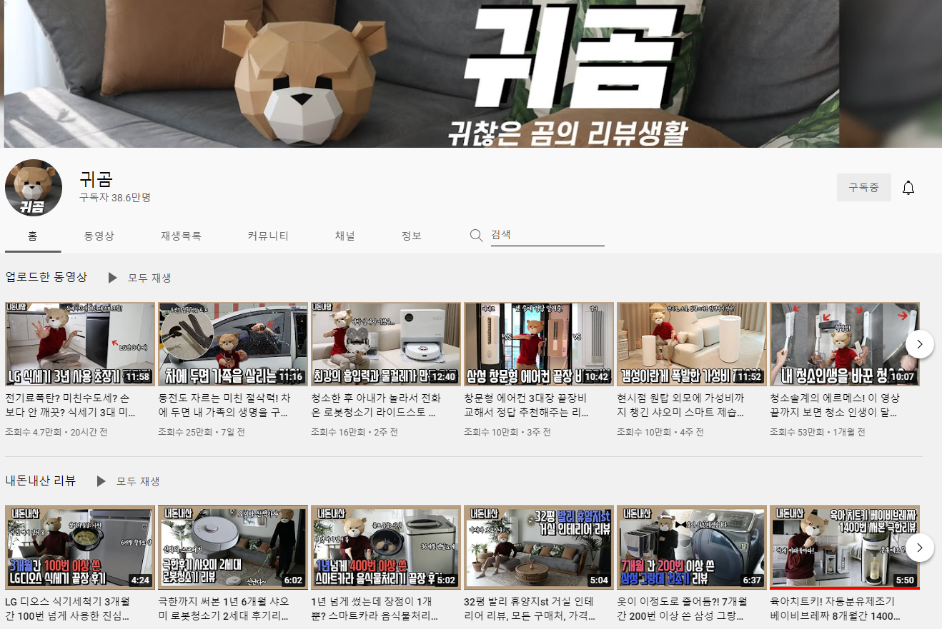 귀찮은 사람들을 위해 귀차니즘이 많은 아저씨가 내돈내산으로 리뷰하는 채널인데, 심지어 웃기기까지 합니다. 제가 자주 본다기보다는 제 남편이 매우 애정 하는 채널인데요. 내돈내산 콘텐츠가 많기 때문에 리뷰 내용에 신뢰가 가고 육아, 비용 등의 현실적인 부분을 고려한 내용을 많이 다루기 때문에 생활 밀착형 콘텐츠라고 보시면 되겠습니다.