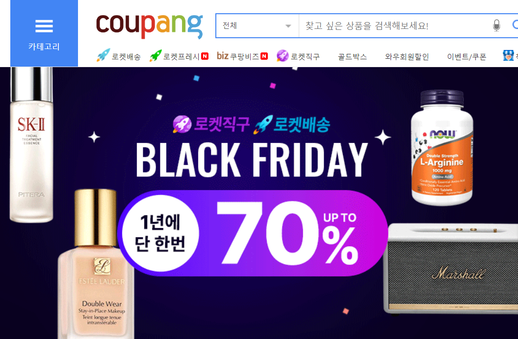 쿠팡은 이번 블랙 프라이데이 행사로 로켓직구와 로켓 배송 직수입 상품을 할인 판매하는 기획전을 11월 27일까지 진행한다고 해요.
