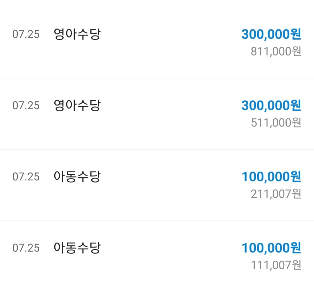 영아 수당은 신생아부터 23개월의 영아들에게 1명의 아이당 월 30만 원이 지급되며 아동 수당은 월 10만 원이 지급됩니다. 아동의 의미는 사실 영아 시기를 지나야 하는 것이지만 저출산 정책이니만큼 영아 시기에도 영아 수당과 아동 수당이 중복 지급되며 진료비와 첫 만남 이용권, 산후조리비와 달리 등록한 계좌로 바로 입금됩니다.