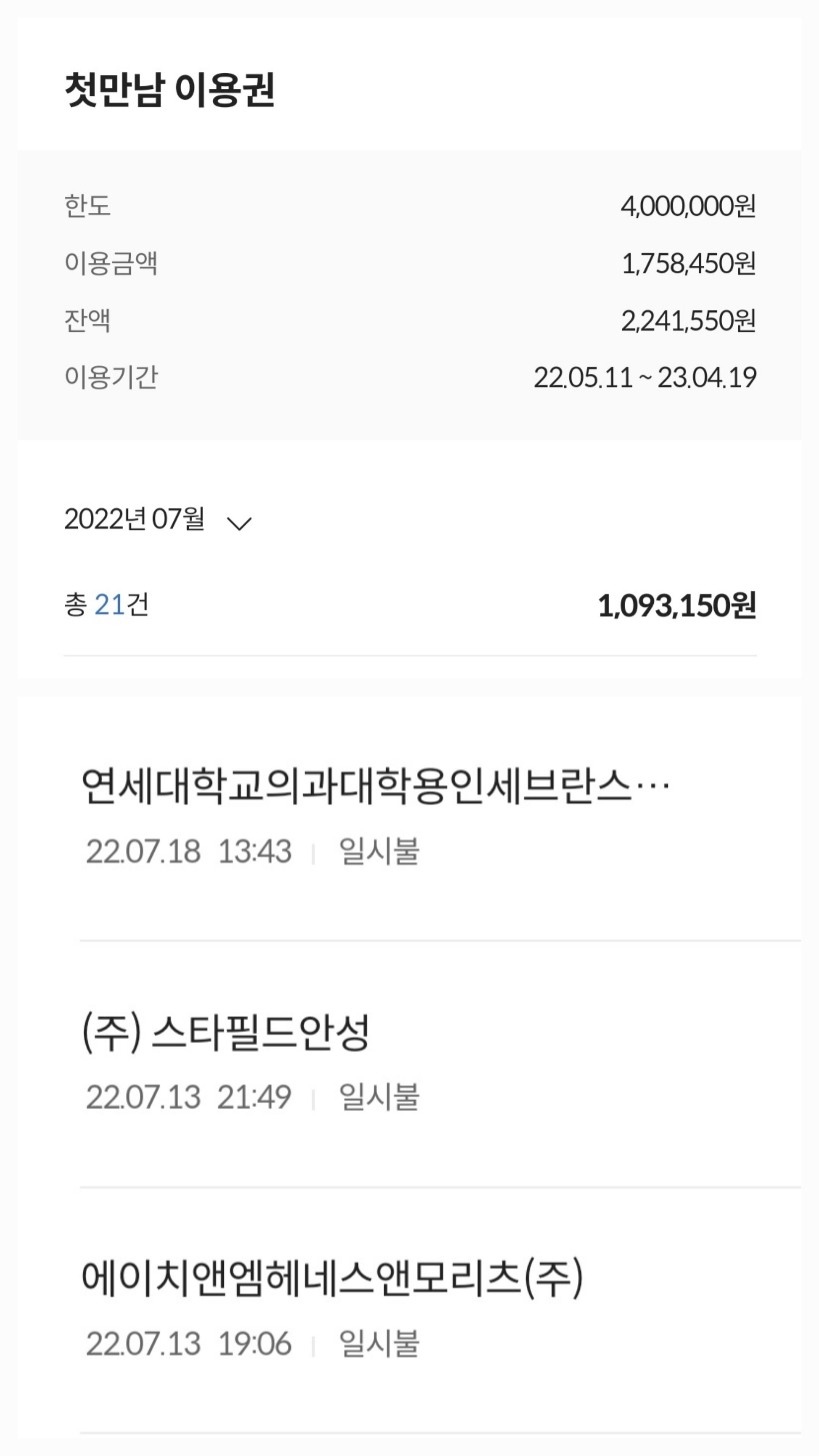 병원이나 약국에서 사용 가능하던 진료비 바우처와 달리 첫 만남 이용권은 마트나 식당과 같은 곳에서 해당 카드로 결제하면 바우처가 자동 사용되더라고요. 각 카드사의 바우처 사용 내역에서 확인할 수 있습니다.