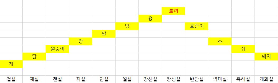 아래 표는 제가 자료를 참고해서 엑셀 표로 만든 것인데요. 내년과의 운의 양과 '살'을 표기하고 있습니다.