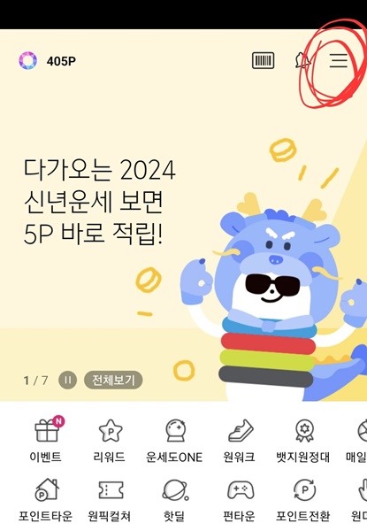 - 앱 배너 신년 운세보기 클릭 또는 우측 상단 메뉴 버튼 클릭해 운세도 One 클릭