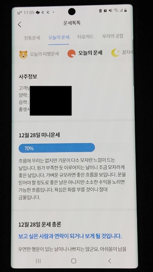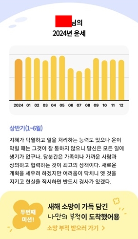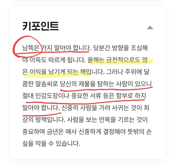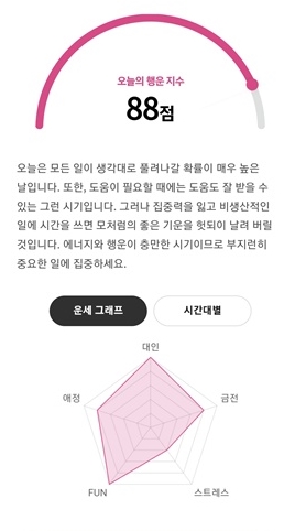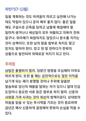 저는 전반적으로 여름보다는 상반기와 4분기가 좋고 상반기에 가족운과 재물운이 좋은데 주변에 방해꾼이 있을 수 있으니 사람을 조심하고 늘 신중하라는 것 같고, 남쪽은 피하라고 하네요. 과연 다른 앱에서도 같은 운세 결과가 나올까요?