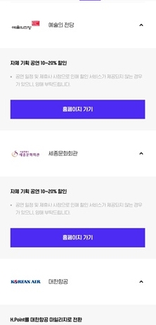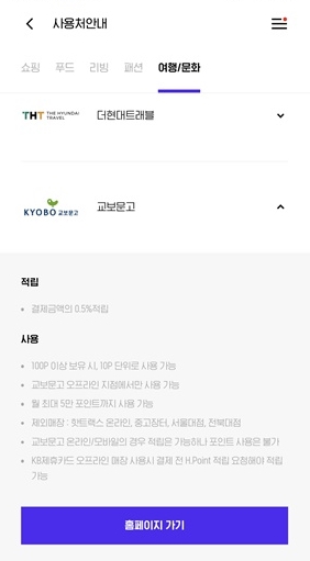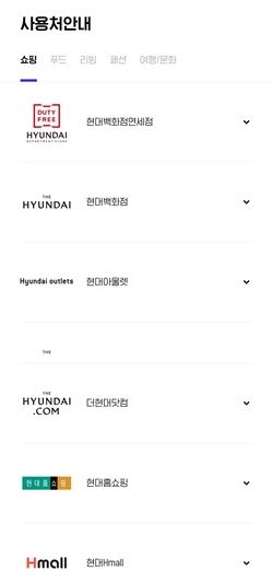 이렇게 모든 H Point 사용처는 현대에서 운영하는 각종 쇼핑몰과 백화점 등에서 사용, 교보문고에서 100P 이상 보유 시 사용, 한섬닷컴에서 100P 이상 보유시 사용, 예술의 전당과 세종문화회관에서 10~20% 할인, 대한항공의 마일리지로 전환도 할 수 있습니다.