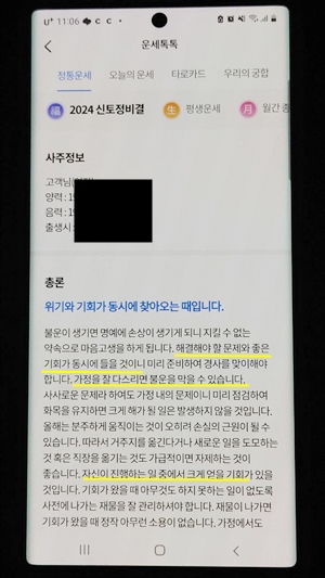 제 경우 운과 위기가 동시에 들어오는 해로 기회가 왔을 때 바로 잡을 수 있도록 재물을 잘 관리해야 한다는 것, 재물운이 크게 쌓이게 될 징조가 있는데 모두 나의 노력으로 일어난다고 하네요. 자신감을 가지고 뜻한 바를 이루라고 합니다. 많은 사람들이 모여들 시기라고 합니다. 대신 6월부터 3개월 동안은 주변에 사람들이 내 재물을 노린다고 하니 조심하라고 하네요. 너무 좋은데요? 다른 앱들도 똑같은 내용을 말해줄까요?