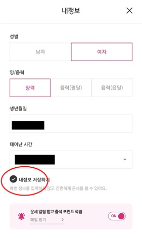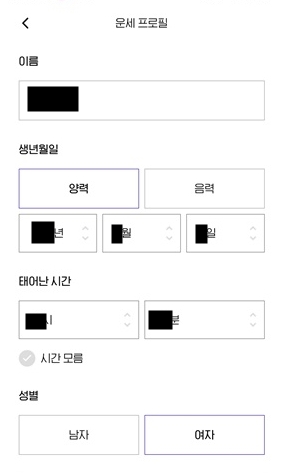 - 이름, 양/음력, 생년월일, 태어난 시, 성별 본인 정보 입력